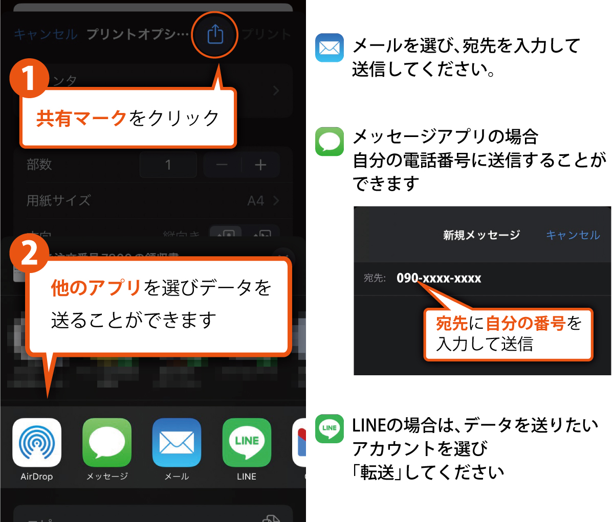 「このページを印刷」ボタンを押したあと表示される画面で、「共有マーク」をクリックし他のアプリ・デバイスを選び送信するとPDFデータが送信されます。(Androidは操作が異なる場合があります)