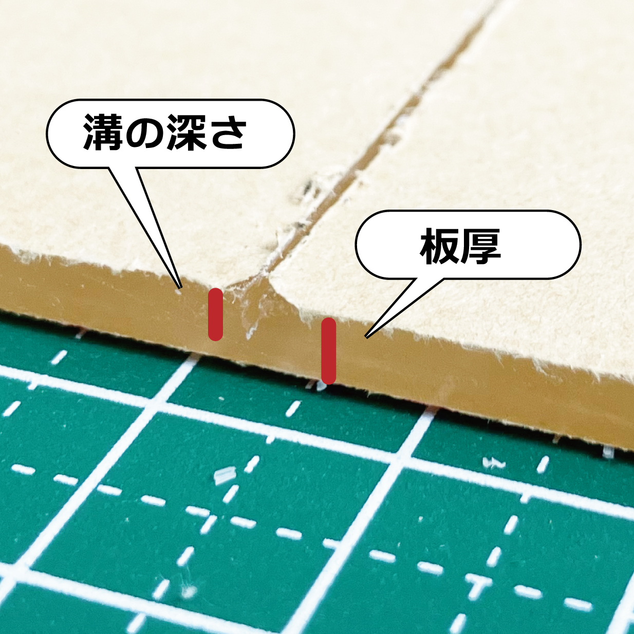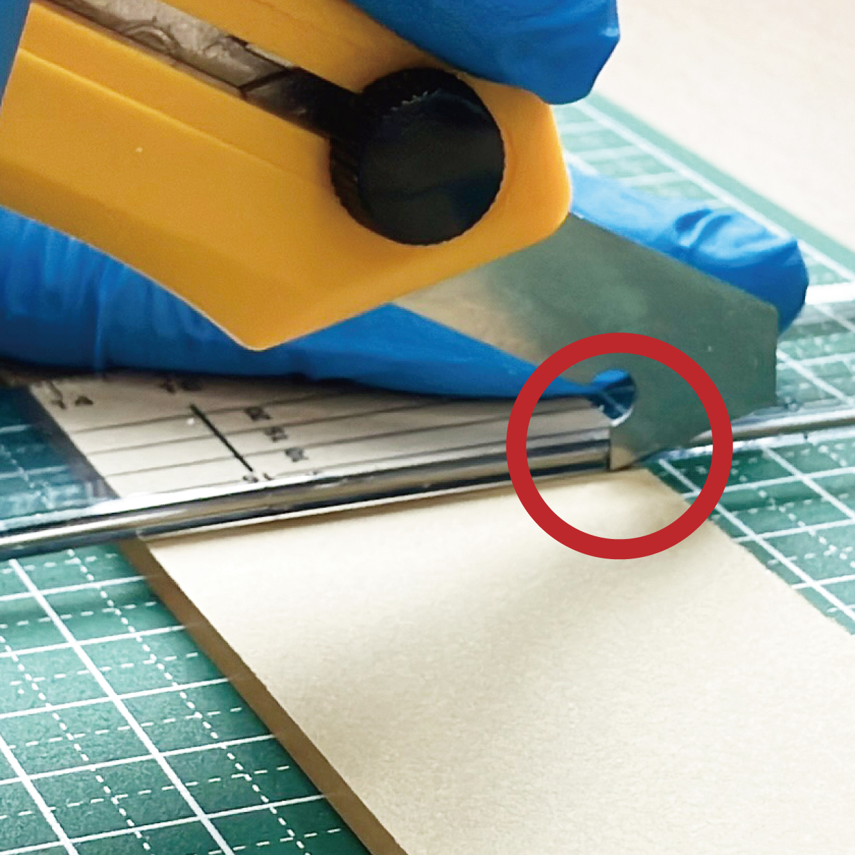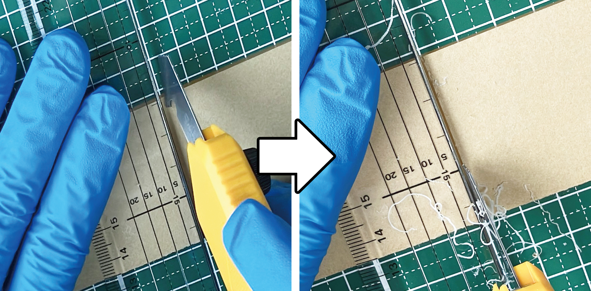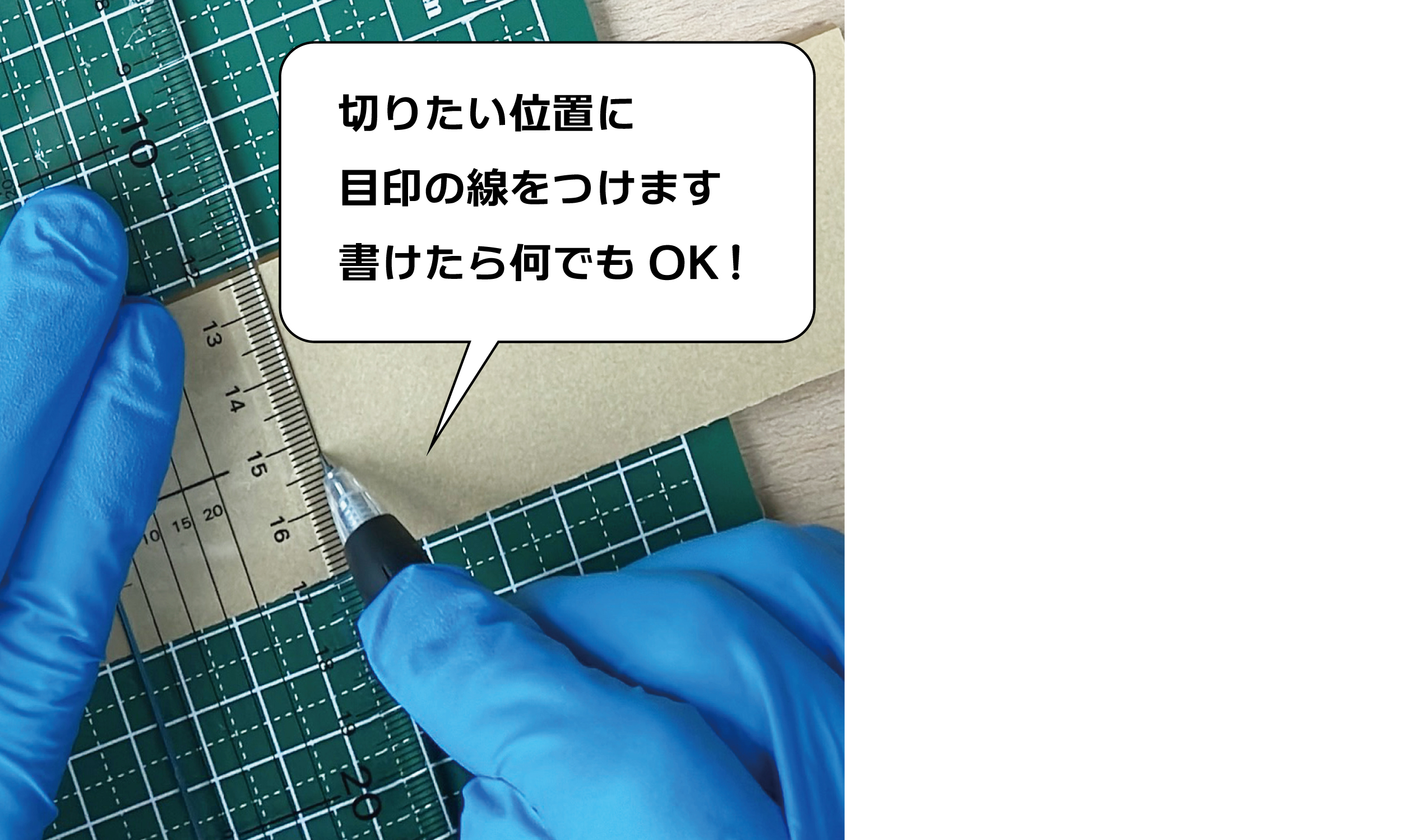引いた線に定規を合わせてしっかりと押さえ、アクリルカッターで定規に沿って切り込んでいきます。 何度も切り込んで溝を掘るようなイメージです。
