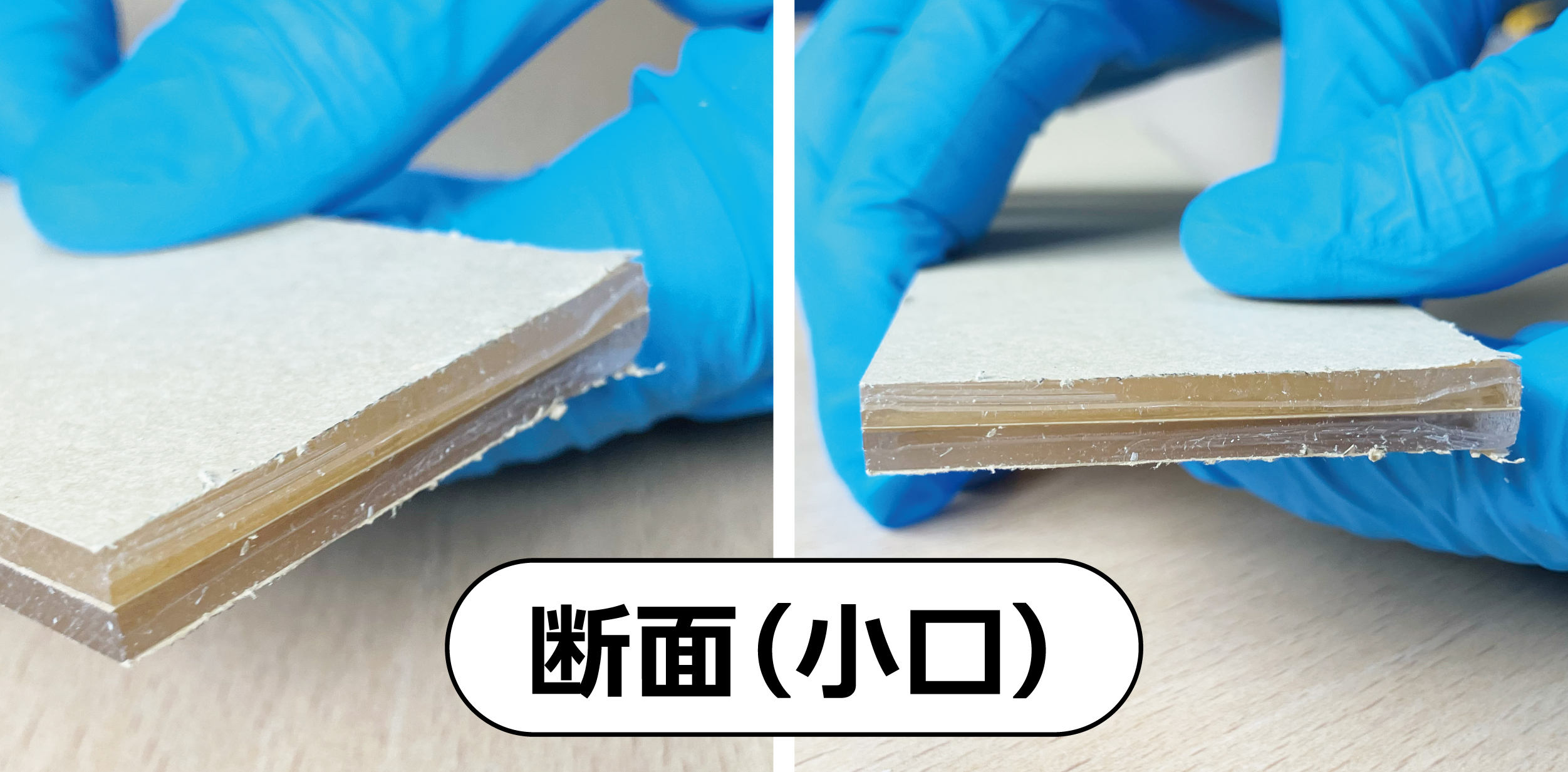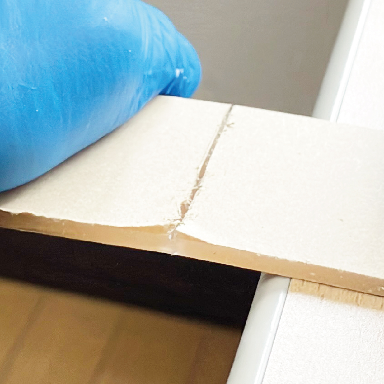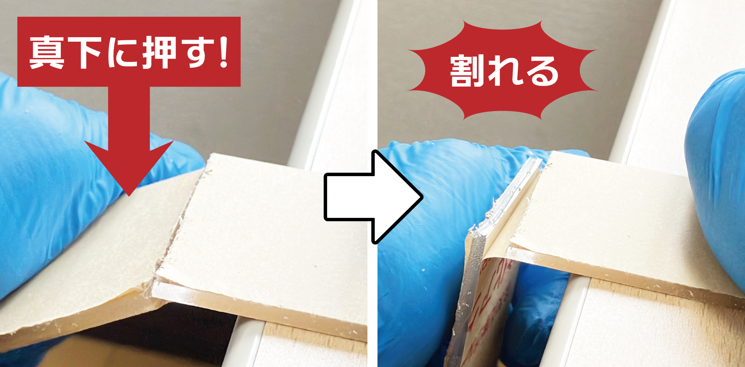 溝が掘れたら、アクリル板の溝が入っていない側をテーブルの上に乗せて押さえます。